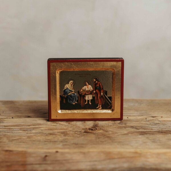Ikona Świętej Rodziny przy pracy o wymiarach 13×10 cm – wyjątkowe przedstawienie Świętej Rodziny w codziennym życiu. Ręcznie wykonana, idealna do modlitwy i refleksji nad duchowością pracy i rodziny.