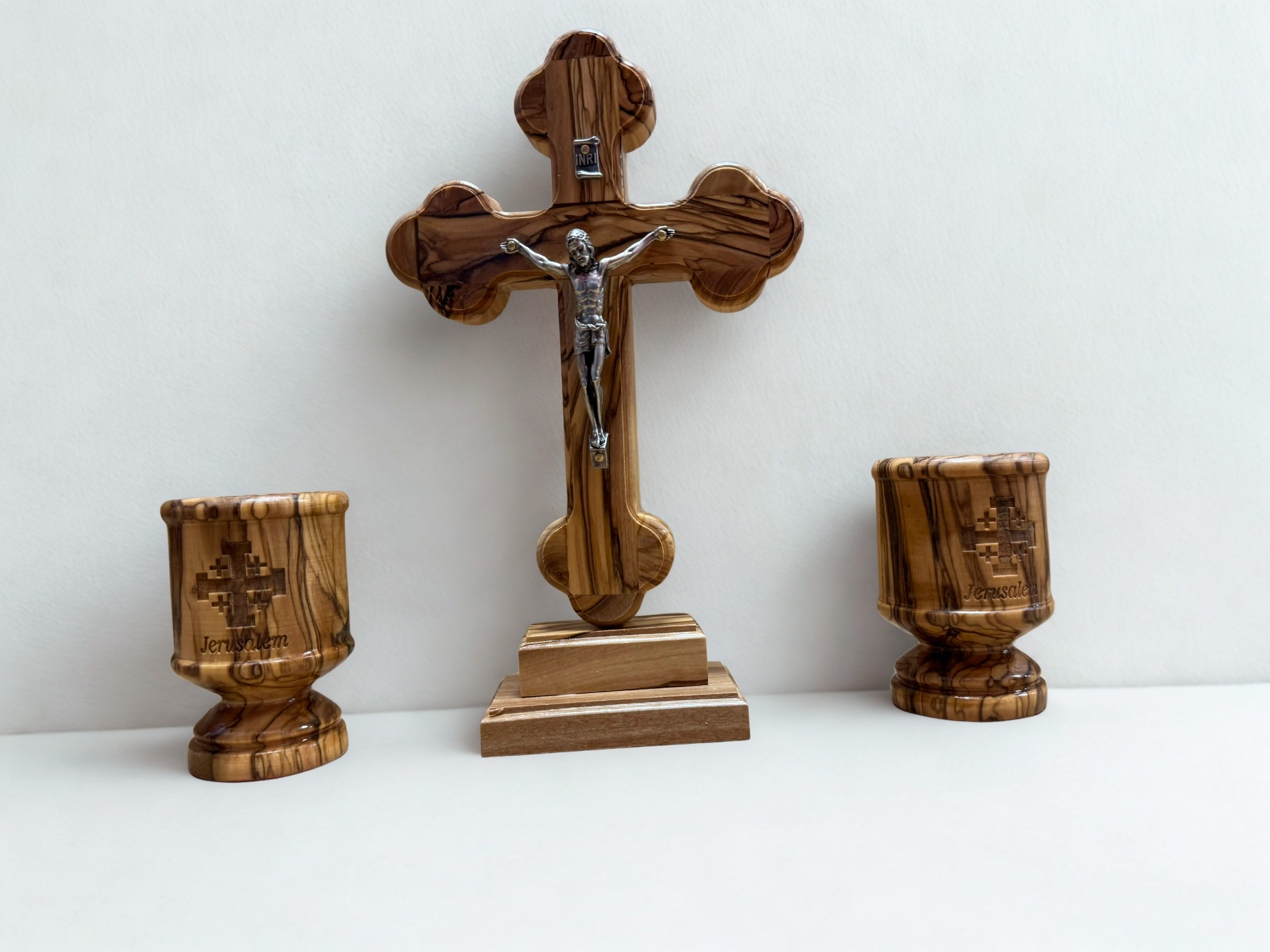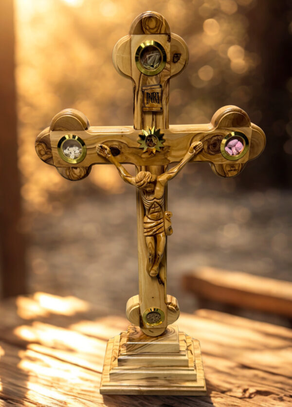 Krzyż Pokoju, wykonany z drewna oliwnego ma około 40 cm wysokości. Jest znakiem modlitwy o pokój i pojednanie – symbolem zwycięstwa życia nad śmiercią oraz nadziei, że tam, gdzie trwa konflikt i cierpienie, Bóg może przynieść ciszę serca i prawdziwy pokój.