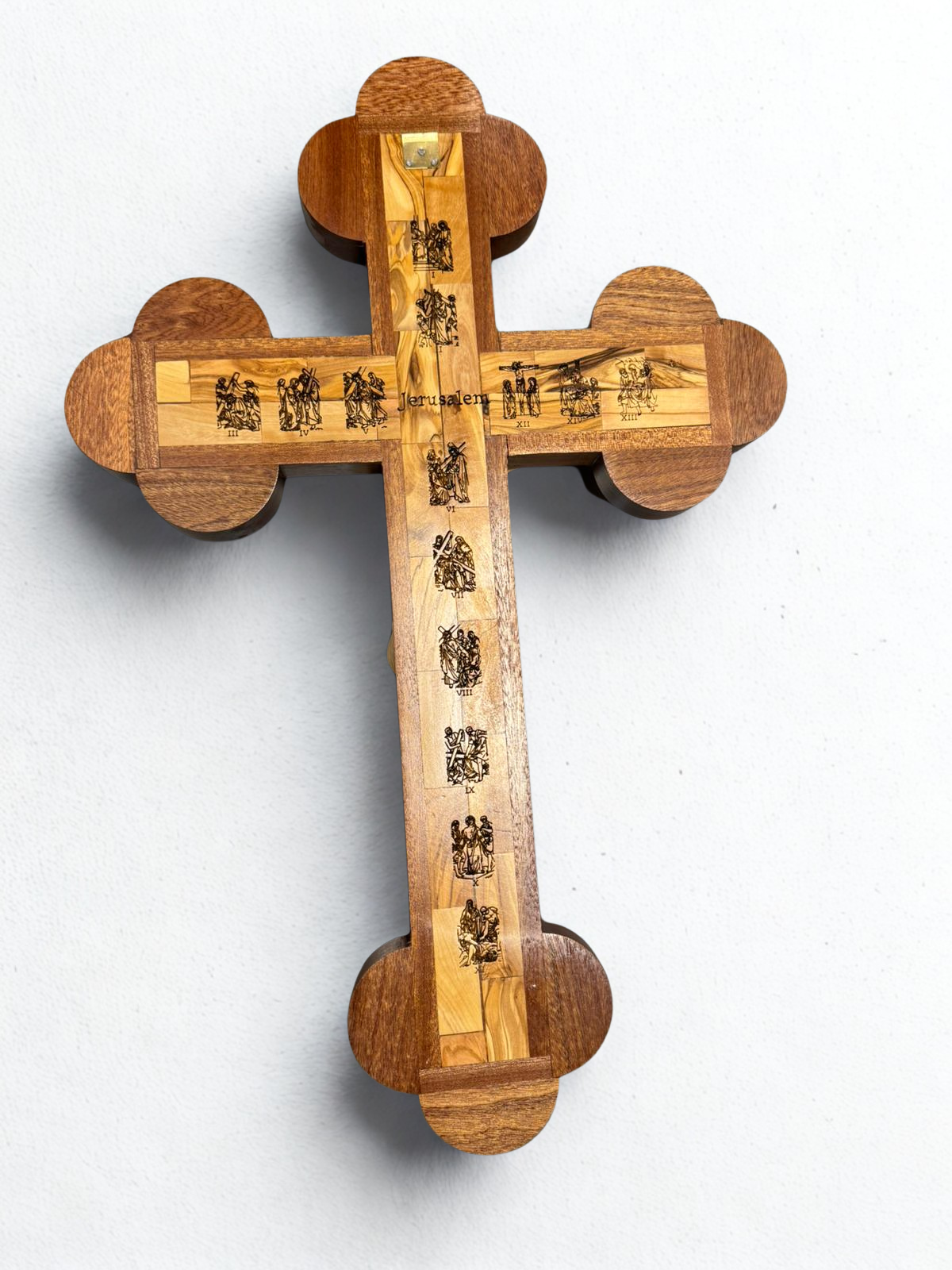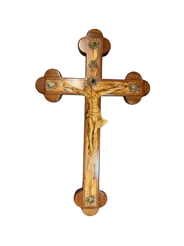 Ręcznie wykonany przez chrześcijan z Ziemi Świętej. Ten wyjątkowy krzyż, wypełniony kapsułami z fragmentami Ziemi Świętej, to nie tylko dzieło sztuki, ale także znak wiary i solidarności. Kupując go, wspierasz chrześcijan w ich ziemskiej ojczyźnie Chrystusa, pomagając im przetrwać i pozostać na tej świętej ziemi. Krzyż ma około 80 cm wysokości.