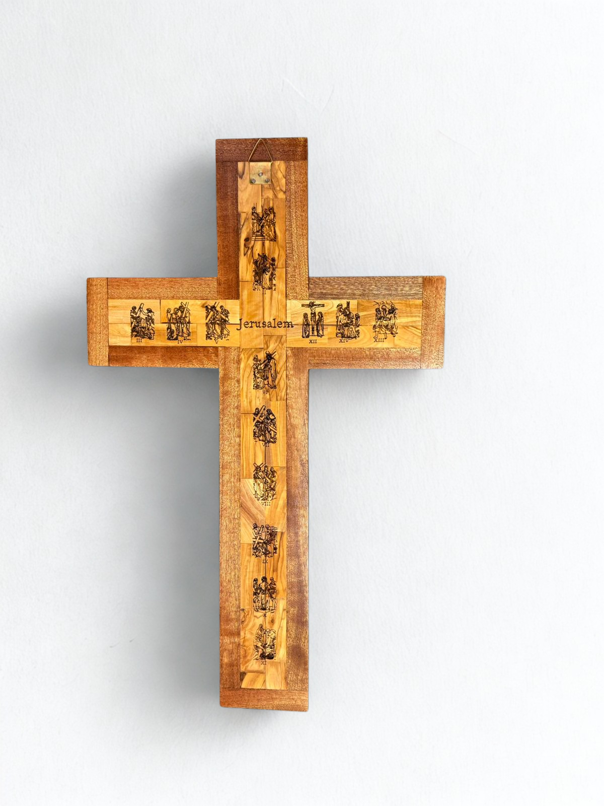 Ręcznie wykonany przez chrześcijan z Ziemi Świętej. Ten wyjątkowy krzyż, wypełniony kapsułami z fragmentami Ziemi Świętej, to nie tylko dzieło sztuki, ale także znak wiary i solidarności. Kupując go, wspierasz chrześcijan w ich ziemskiej ojczyźnie Chrystusa, pomagając im przetrwać i pozostać na tej świętej ziemi. Krzyż ma 55 cm wysokości.